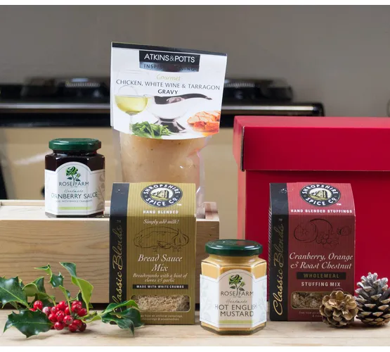 With Rose Farm Cranberry Sauce, Rose Farm Hot English Mustard, Chicken, White Wine & Tarragon Gravy, Shropshire Spice Bread Sauce, as well as your choice of stuffing, this all encompassing selection makes it easy to enhance any Christmas dinner with delicious condiments and extras.